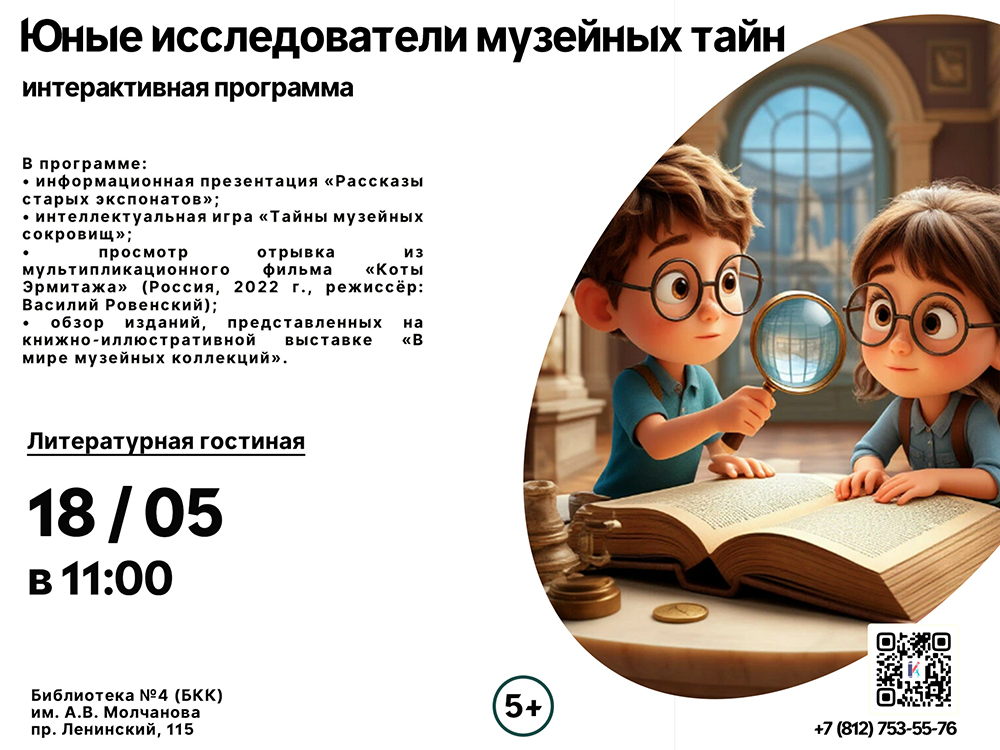 18 мая в 11.00 в литературной гостиной Библиотеки №4 (Библиотечно-культурного комплекса) им. А. В. Молчанова (Ленинский пр., д. 115) состоится Интерактивная программа "Юные исследователи музейных тайн".