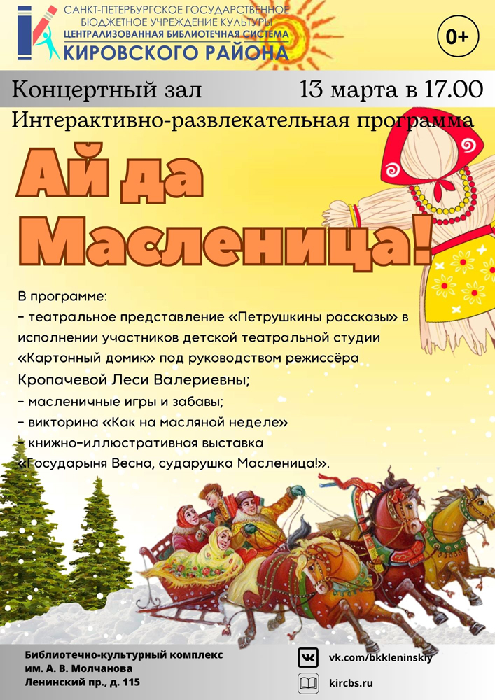 13 марта в 17.00 в Концертном зале Библиотечно-культурного комплекса им. А. В. Молчанова (Ленинский пр., д. 115) состоится Интерактивно-развлекательная программа "Ай да Масленица!".