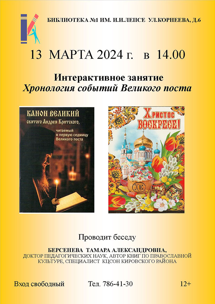 Библиотека №1 им. И. И. Лепсе приглашает всех желающих на Интерактивное занятие "Хронология событий Великого поста" в рамках программы "Духовное возрождение. Основы православной веры и культуры".