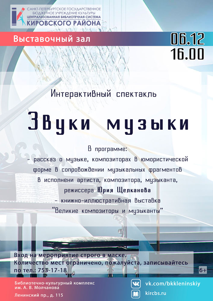 6 декабря в 16.00 в выставочном зале Библиотечно-культурного комплекса им. А. В. Молчанова, в рамках мероприятий Всероссийского фестиваля "Эстафета доброты - 2021", состоится Интерактивный спектакль "Звуки музыки".