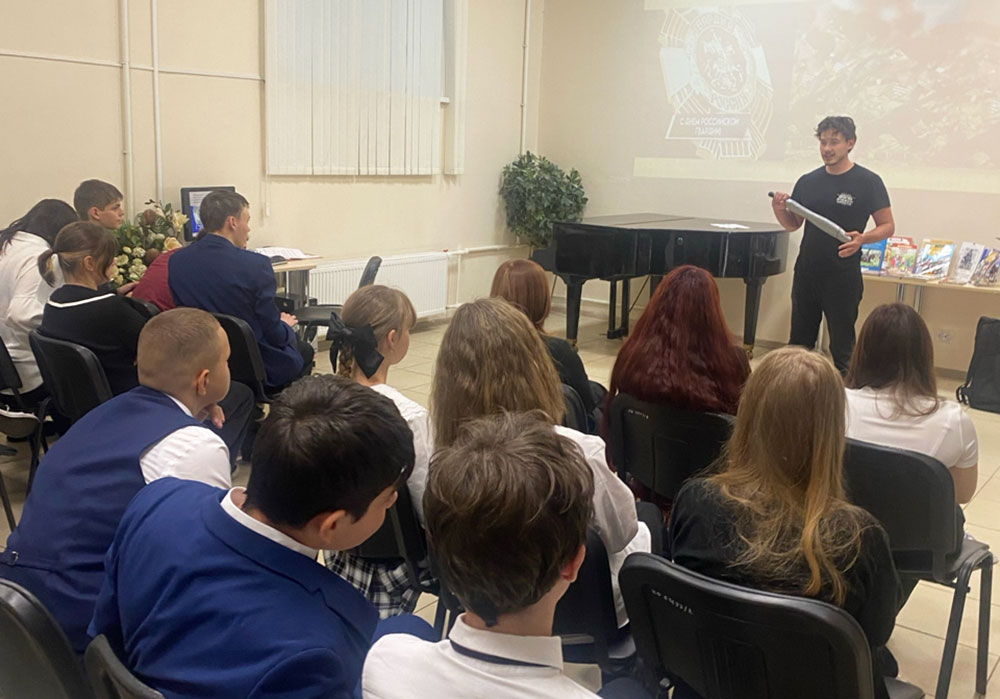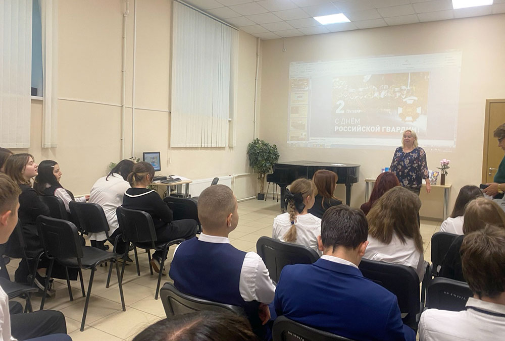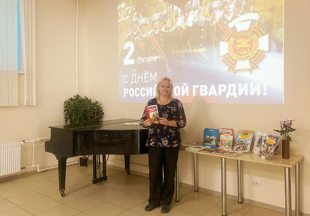 После просмотра информационной презентации "День Российской гвардии" юные участники встречи приняли участие в беседе "Гордость России", во время которой узнали об истории гвардии: вспомнили Петра Первого и его потешные войска, которые были преобразованы в гвардейские. В 2000 году Гвардия России отметила 300-летие. Погружение в историю страны завершилось обзором книжно-иллюстративной выставки "Воинская доблесть Отечества".