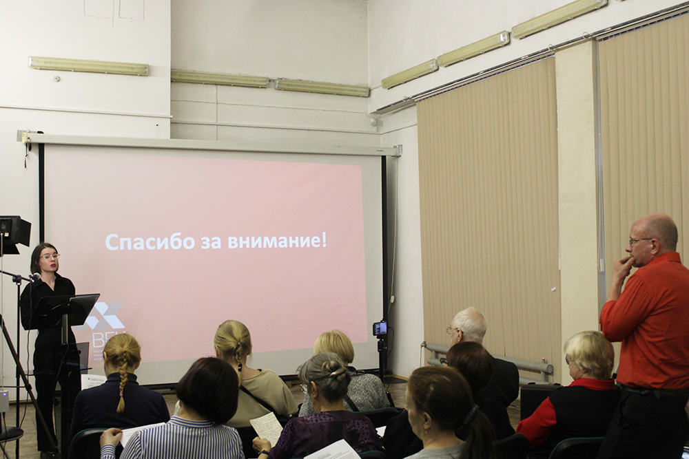 В первом выступлении Русяева Елена Николаевна (куратор Культурно-просветительского центра Библиотеки №9 им. Д. Гранина, СПБ ГБУ "Невская ЦБС") рассказала о деятельности Д. А. Гранина, как сценариста. Основная часть доклада рассказывала о его работе над сценарием к фильму "Искатели" (1956), поставленному по одноименному роману. Елена Николаевна рассказала о принципах, которыми руководствовался Даниил Александрович в подходе к киносценариям и о важности для писателя работать в кино.