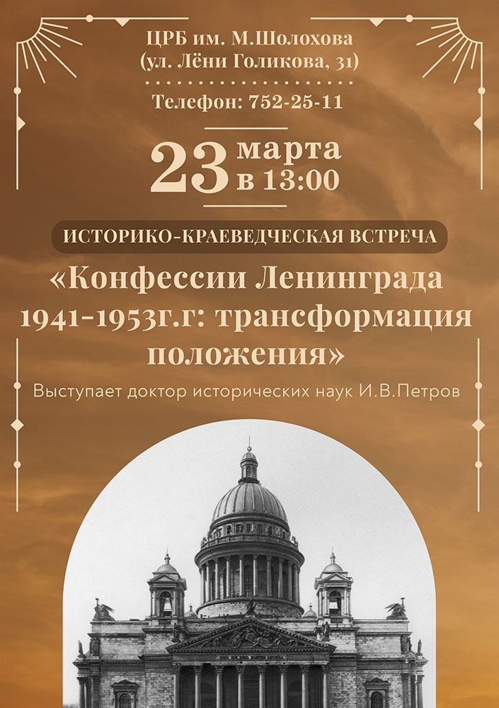 Центральная библиотека Кировского района имени М. Шолохова приглашает своих читателей и жителей города на встречу с историком, кандидатом наук, Иваном Васильевичем Петровым. Тема встречи "Конфессии Ленинграда в 1941-1953 годы: трансформация положения".