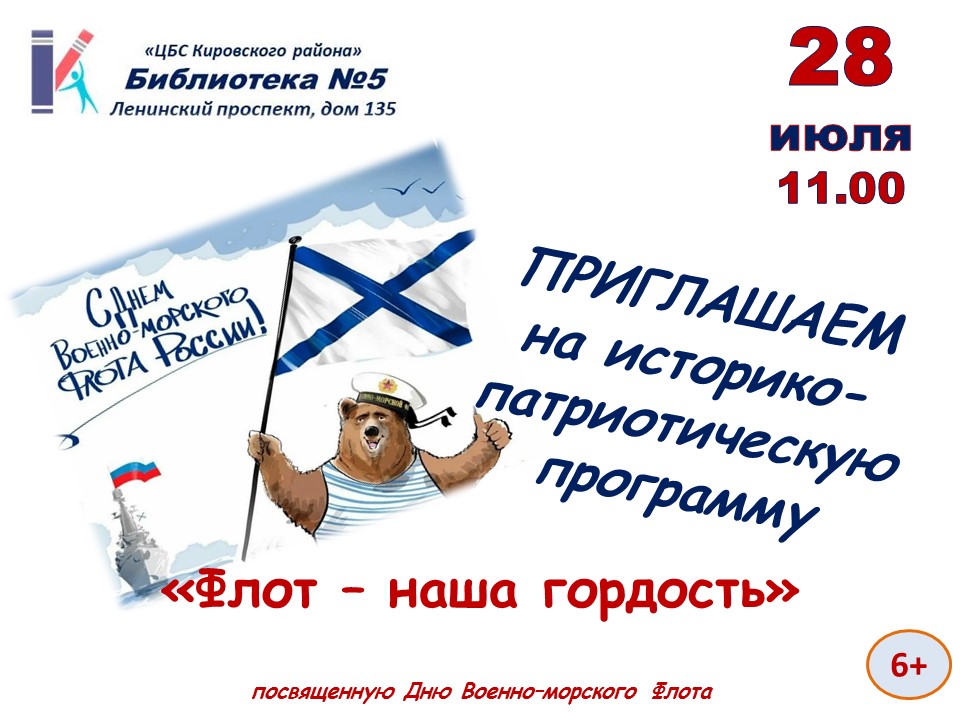 В праздничный день в Библиотеке №5 (Ленинский пр., д. 135), состоится Историко-патриотическая программа "Флот - наша гордость", посвященный Дню Военно-морского флота России.