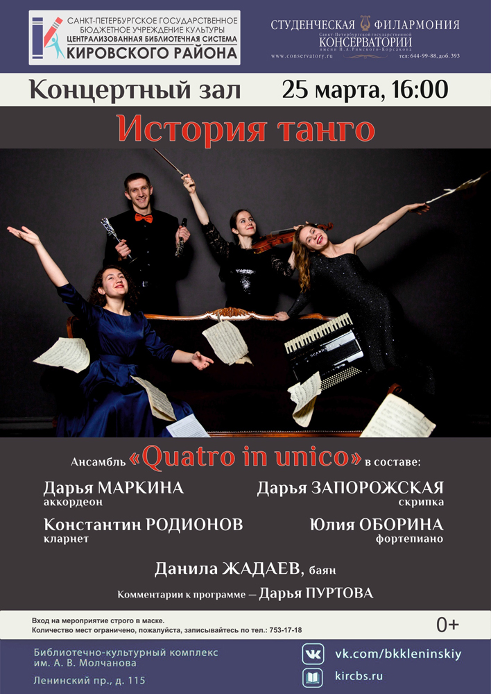 25 марта в 16.00 в концертном зале Библиотечно-культурного комплекса им. А. В. Молчанова в исполнении ансамбля "Quatro in unico" прозвучит программа "История танго".