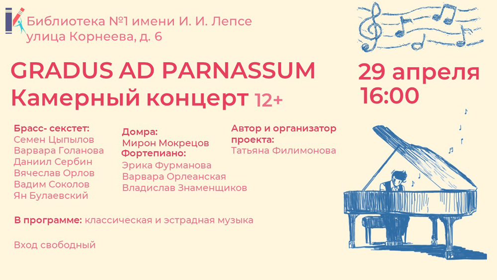 Библиотека №1 им. И. И. Лепсе приглашает всех желающих на Камерный концерт "Gradus ad Parnassum" в исполнении студентов Санкт-Петербургского музыкального училища им. Н. А. Римского-Корсакова.