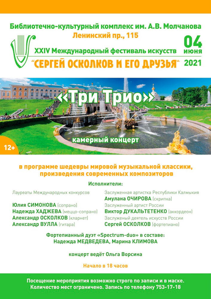 4 июня в 18.00 в концертном зале Библиотечно-культурного комплекса им. А. В. Молчанова, в рамках XXIV Международного фестиваля искусств "Сергей Осколков и его друзья", состоится Камерный концерт "Три Трио".