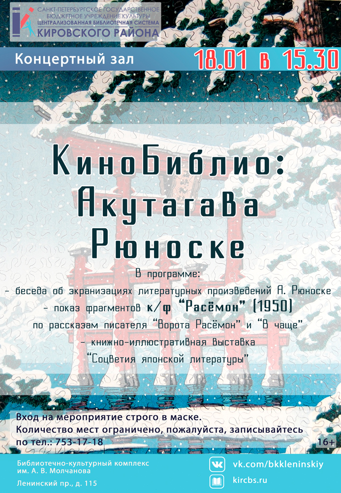 18 января в 15.30 в концертном зале Библиотечно-культурного комплекса им. А. В. Молчанова состоится встреча в киногостиной "КиноБиблио: Акутагава Рюноске".