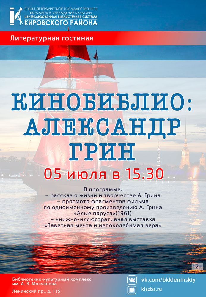 5 июня в 15.30 в литературной гостиной Библиотечно-культурного комплекса им. А. В. Молчанова будет проходить встреча в киногостиной "КиноБиблио: Александр Грин".