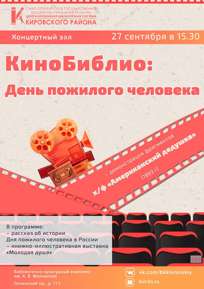 27 сентября в 15.30 в Библиотечно-культурном комплексе им. А. В. Молчанова пройдет киносалон "КиноБиблио: День пожилого человека".