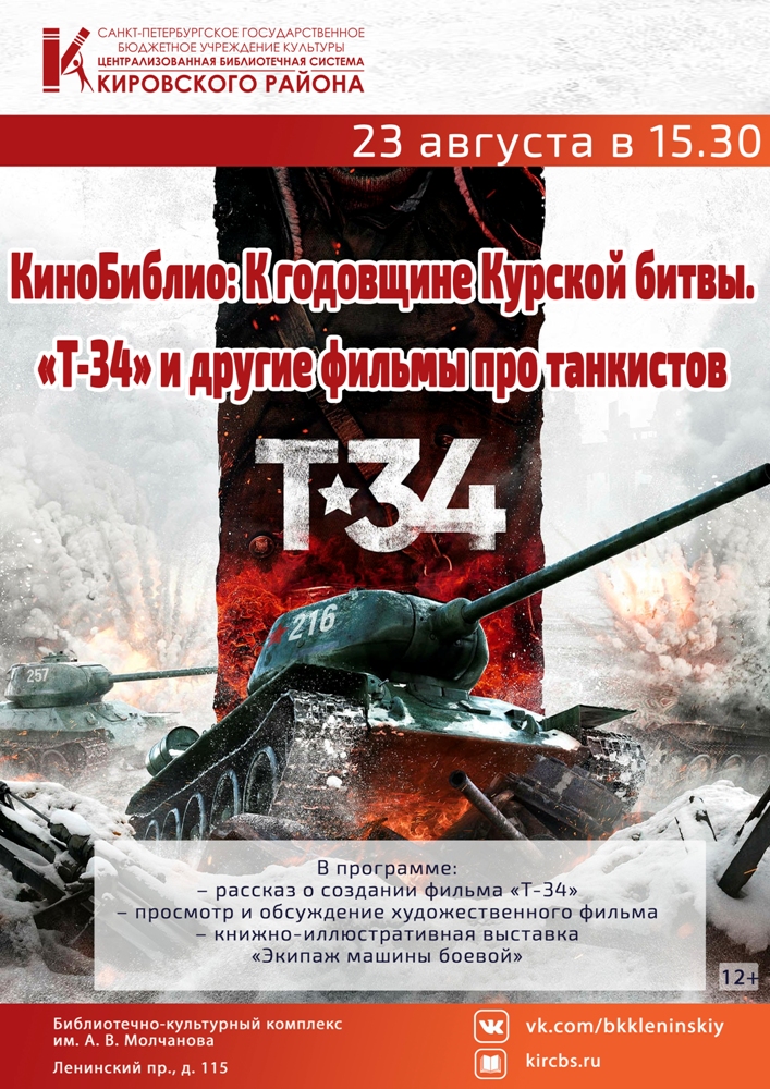 23 августа в 15:30 в Библиотечно-культурном комплексе им. А.В. Молчанова состоится киногостиная "КиноБиблио: К годовщине Курской битвы. "Т-34" и другие фильмы про танкистов".