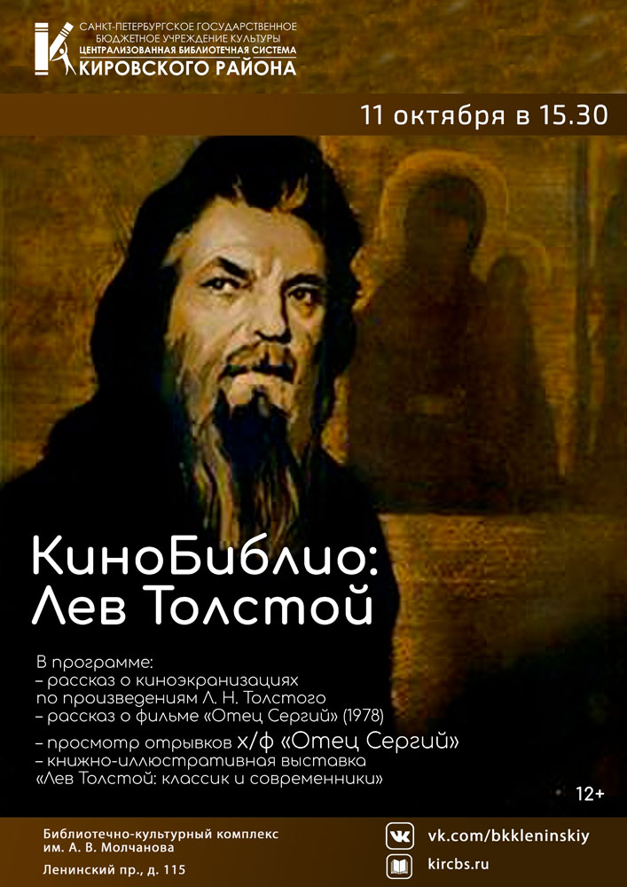 11 октября в 15:30 в Библиотечно-культурном комплексе им. А. В. Молчанова состоится очередная встреча в киногостиной "КиноБиблио: Лев Толстой".