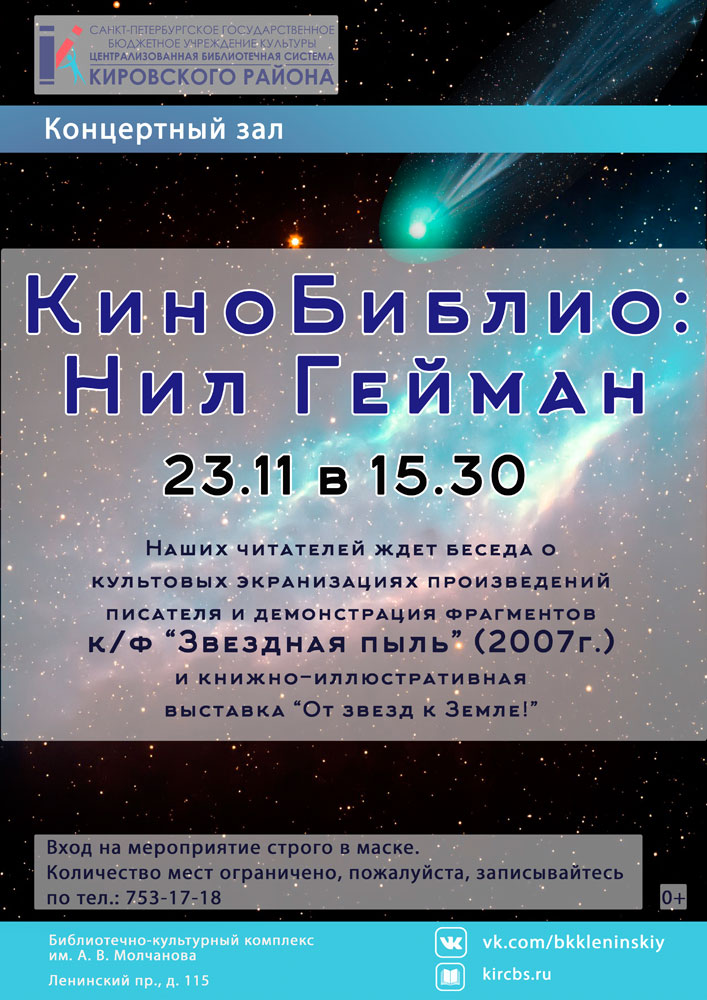 23 ноября в 15.30 в концертном зале Библиотечно-культурного комплекса им. А. В. Молчанова состоится встреча в киногостиной "КиноБиблио: Нил Гейман".