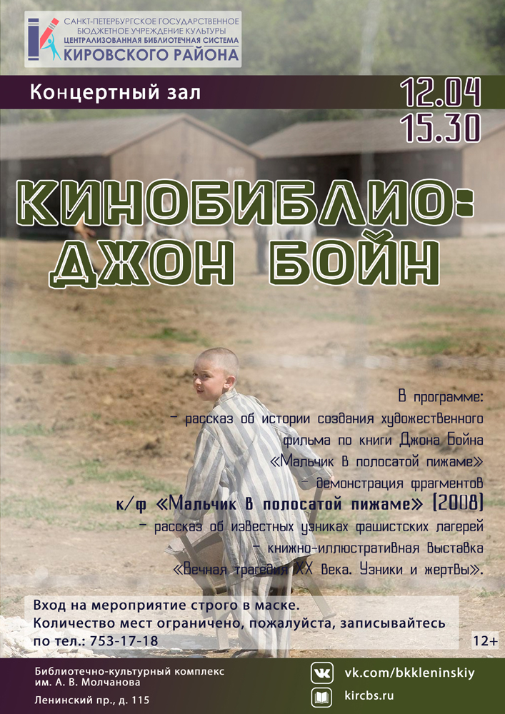 12 апреля в 15.30 в концертном зале Библиотечно-культурного комплекса им. А. В. Молчанова будет проходить Киногостиная "КиноБиблио: Джон Бойн".
