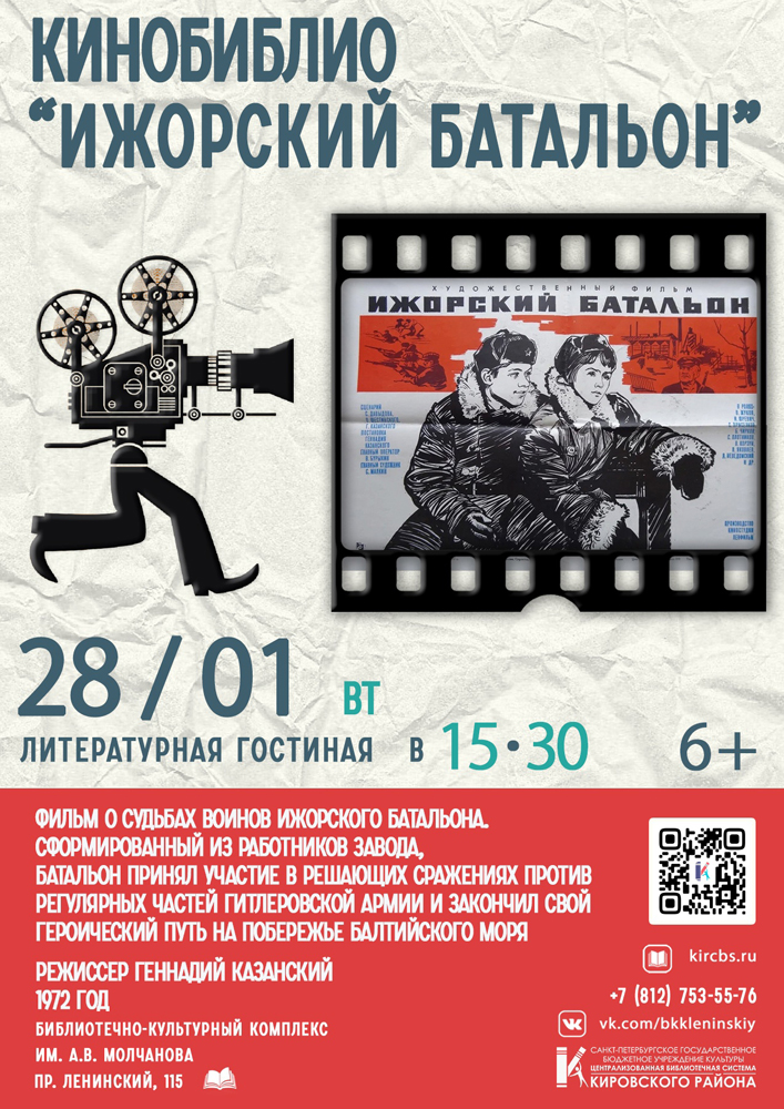 28 января в 15.30 в Литературной гостиной Библиотечно-культурного комплекса им. А. В. Молчанова (Ленинский пр., д. 115) состоится встреча участников клубного объединения - Киногостиная "КиноБиблио": "Ижорский батальон".