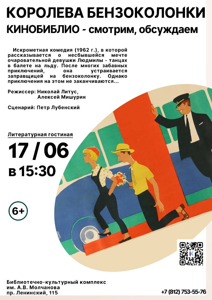 17 июня в 15.30 в Литературной гостиной Библиотечно-культурного комплекса им. А. В. Молчанова (Ленинский пр., д. 115) состоится встреча участников клубного объединения - Киногостиная "КиноБиблио": "Королева бензоколонки".