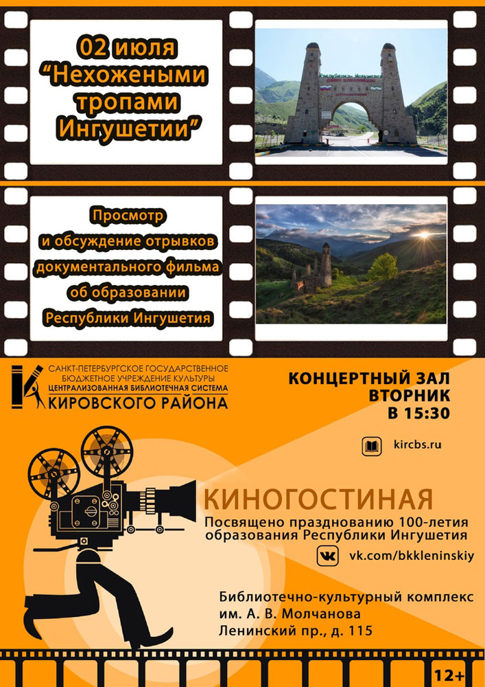 2 июля в 15.30 в Концертном зале Библиотечно-культурного комплекса им. А. В. Молчанова (Ленинский пр., д. 115) состоится Киногостиная "Кинобиблио": "Нехожеными тропами Ингушетии", посвящённая празднованию 100-летия образования Республики Ингушетия.
