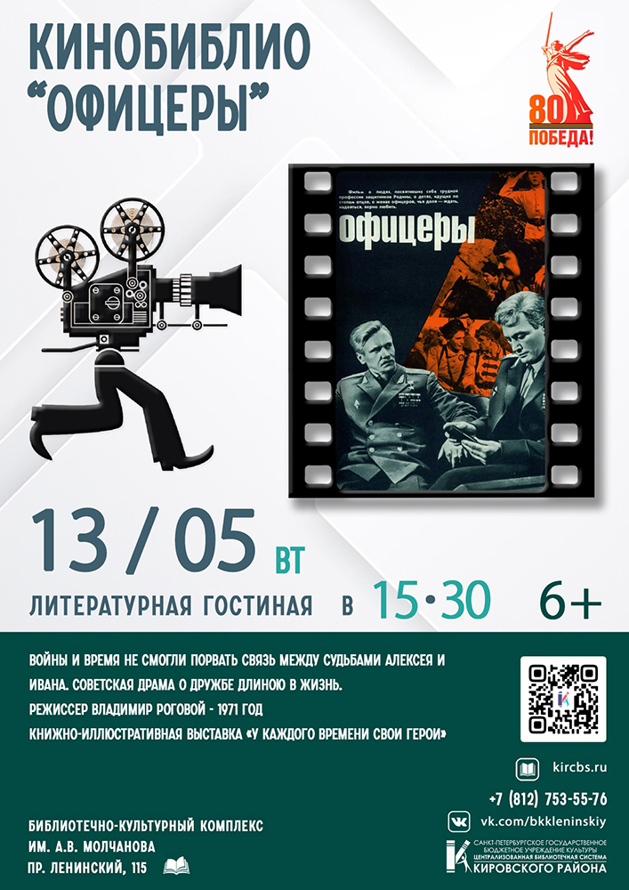 13 мая в 15.30 в Литературной гостиной Библиотечно-культурного комплекса им. А. В. Молчанова (Ленинский пр., д. 115) состоится встреча участников клубного объединения - Киногостиная "КиноБиблио": "Офицеры".