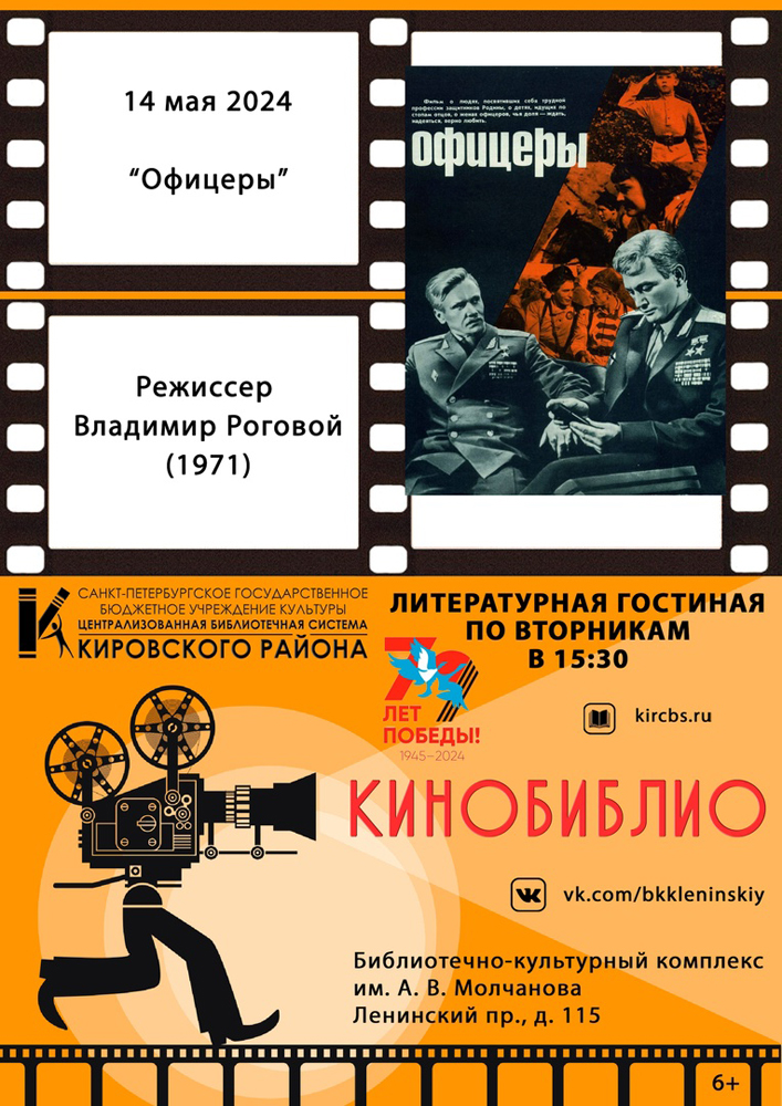 14 мая в 15.30 в Литературной гостиной Библиотечно-культурного комплекса им. А. В. Молчанова (Ленинский пр., д. 115) состоится встреча участников клубного объединения - киногостиная: "КиноБиблио": "Офицеры".