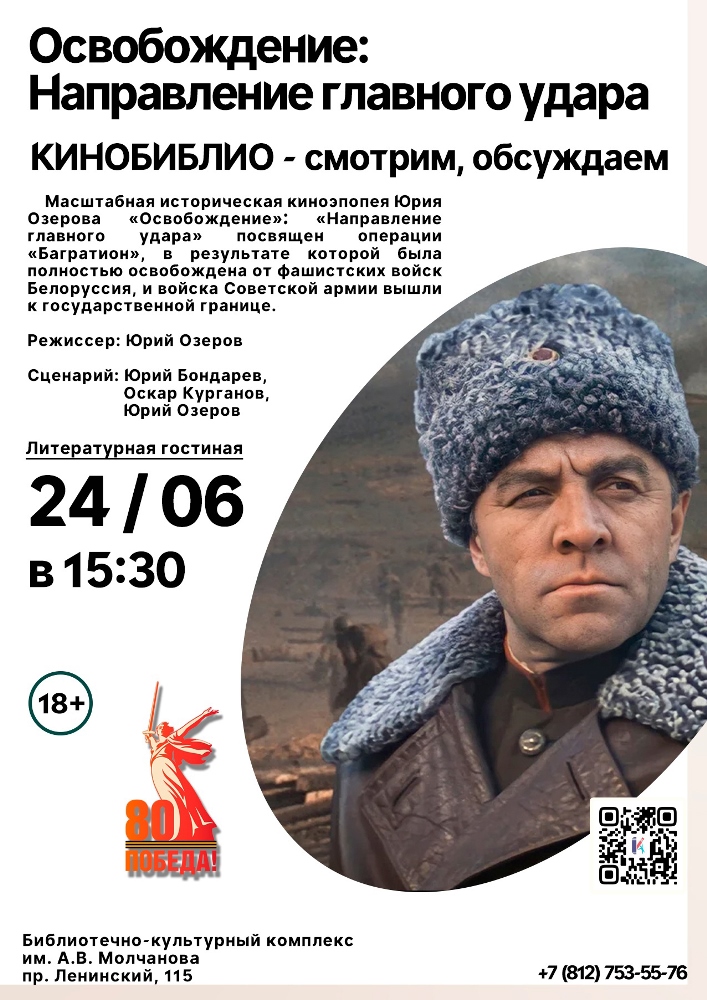 24 июня в 15.30 в Литературной гостиной Библиотечно-культурного комплекса им. А. В. Молчанова (Ленинский пр., д. 115) состоится встреча участников клубного объединения - Киногостиная "КиноБиблио": "Освобождение: Направление главного удара".