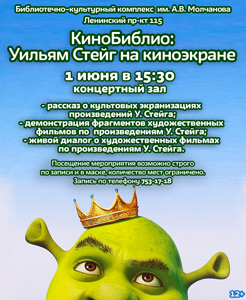 На встрече "КиноБиблио: Уильям Стейг на киноэкране" посетители услышат рассказ о культовых экранизациях произведений У. Стейга, увидят фрагменты художественных фильмов и примут участие в диалоге о художественных фильмах по произведениям писателя.