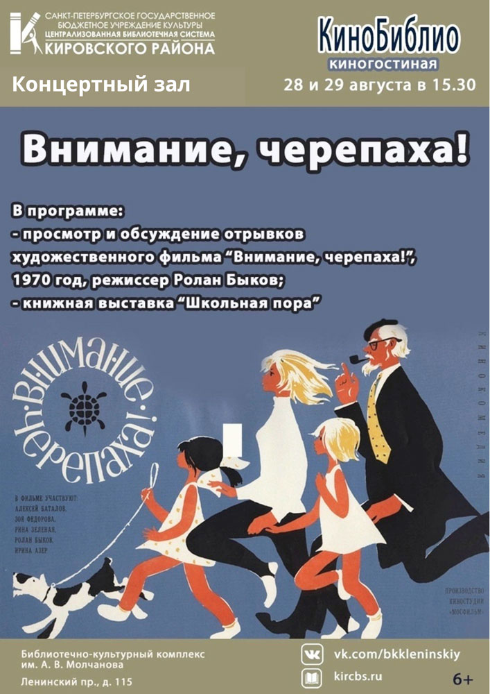28 и 29 августа в концертном зале Библиотечно-культурного комплекса им. А. В. Молчанова (Ленинский пр., д. 115) состоится Киногостиная "КиноБиблио: Внимание, черепаха!".