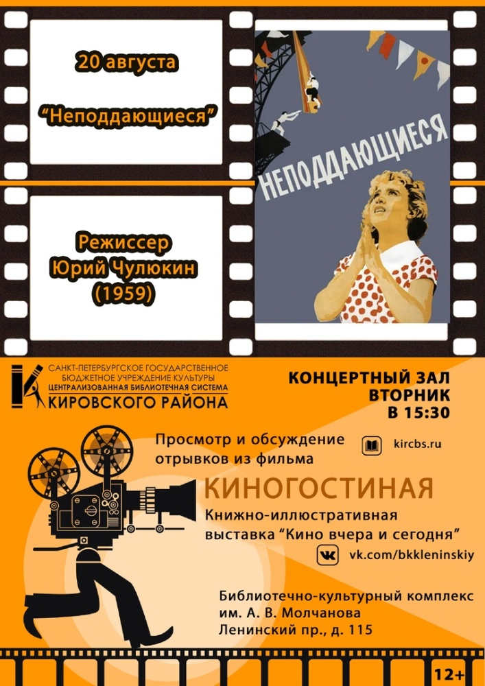 20 августа в 15.30 в Концертном зале Библиотеки №4/ Библиотечно-культурном комплексе им. А.В. Молчанова (Ленинский пр., д. 115) состоится Киногостиная "Неподдающиеся".