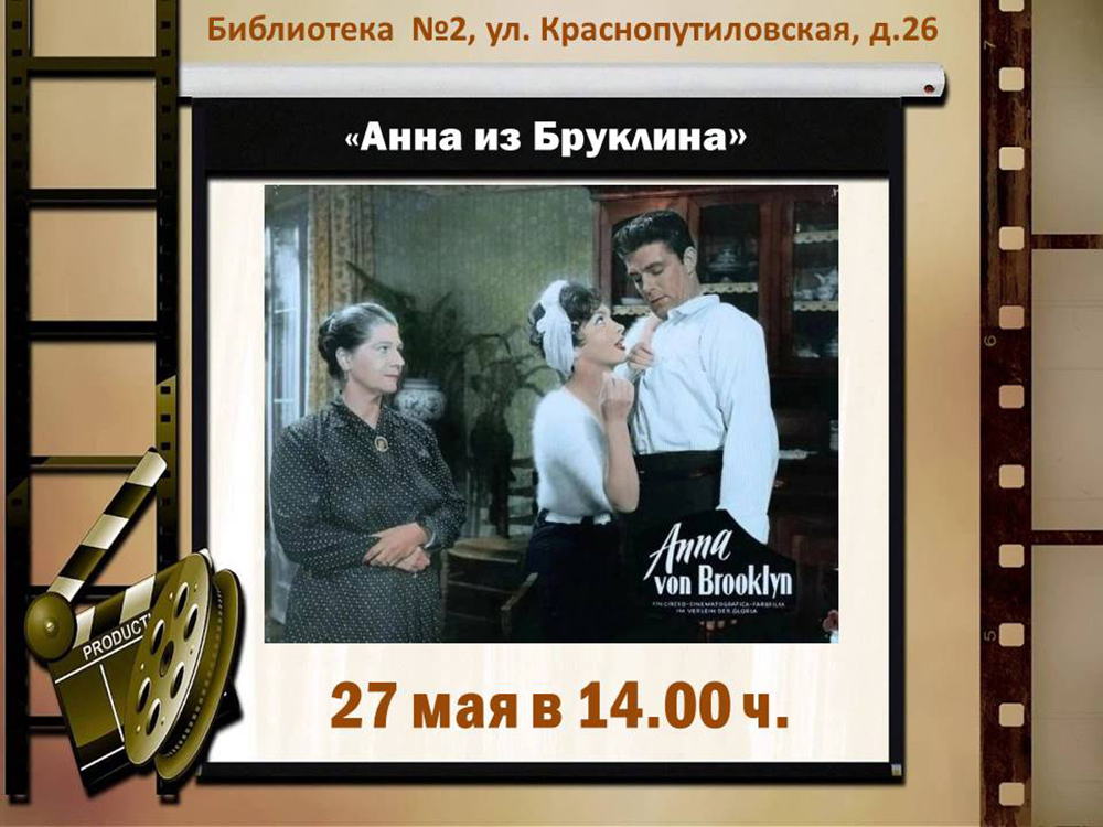 27 мая 2026 года в 14.00 в Библиотеке №2 в рамках Киноклуба "Ретрокино" состоится показ комедии "Анна из Бруклина" (Франция, Италия, 1958).