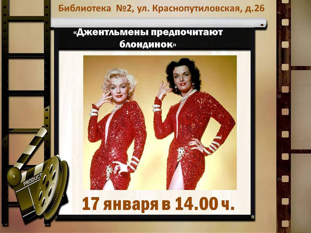 Библиотека №2 приглашает на показ мюзикла "Джентльмены предпочитают блондинок" (США, 1953) в рамках Киноклуба "Ретрокино".