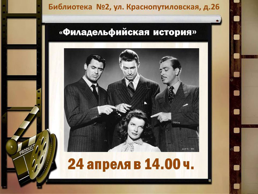 Библиотека №2 приглашает на показ комедии "Филадельфийская история" (США, 1940) в рамках Киноклуба "Ретрокино".