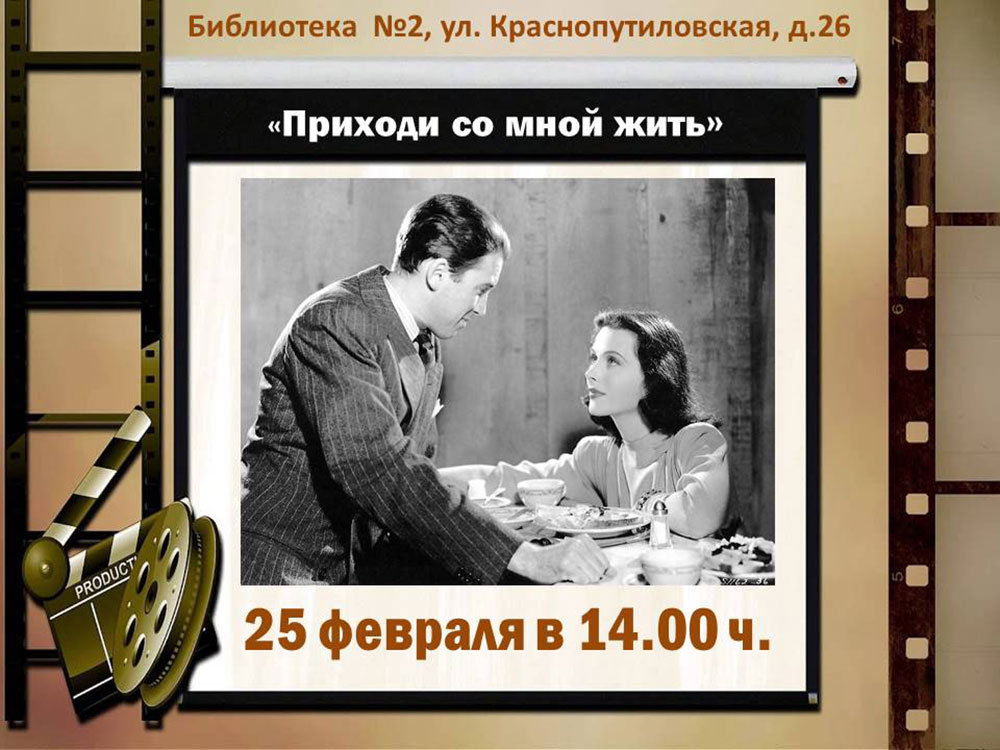 25 февраля 2026 года в 14.00 в Библиотеке №2 в рамках Киноклуба "Ретрокино" состоится показ мелодрамы "Приходи со мной жить" (США, 1941).
