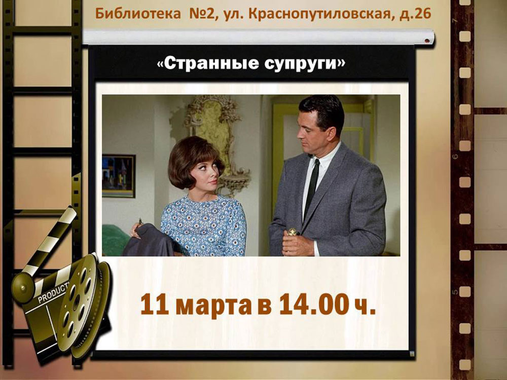 11 марта 2026 года в 14.00 в Библиотеке №2 в рамках Киноклуба "Ретрокино" состоится показ комедии "Странные супруги" (США, 1965).