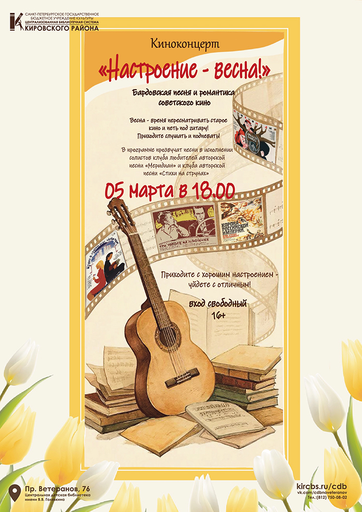 5 марта в 18.00 в Центральной детской библиотеке им. В. В. Голявкина (пр. Ветеранов, д. 76) состоится Киноконцерт "Настроение - весна!" (6+).