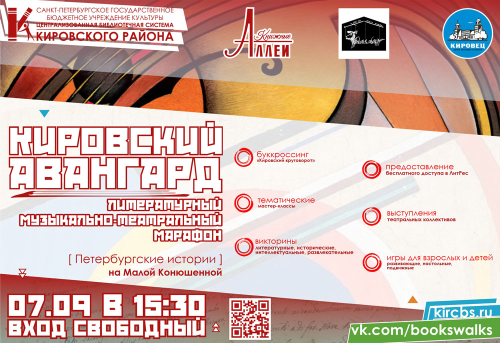 7 сентября 2024 года с 15.30 до 17.30 часов Централизованная библиотечная система Кировского района (далее ЦБС Кировского района) и учреждения культуры Кировского района примут участие в ежегодном книжно-просветительском проекте - фестивале "Книжные аллеи" с программой литературного музыкально-театрального марафона "Кировский авангард".