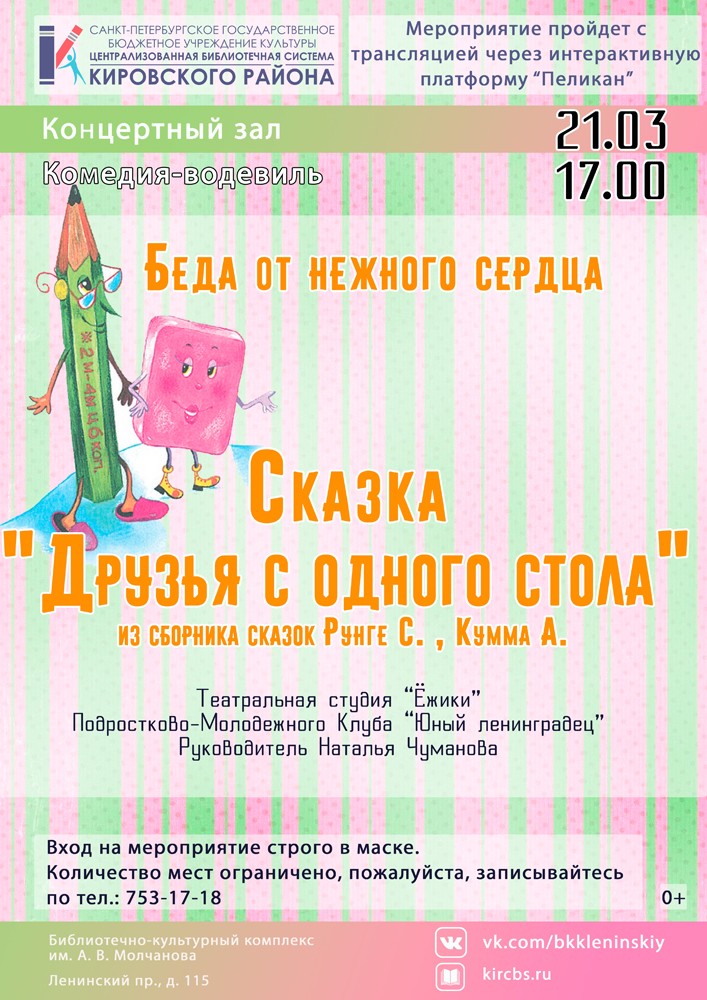 Гости программы увидят сказку "Друзья с одного стола" из сборника Рунге С. и Кумма А. в исполнении театральной студии "Ёжики" Подростково-Молодежного клуба "Юный ленинградец" под руководством Натальи Чумановой.