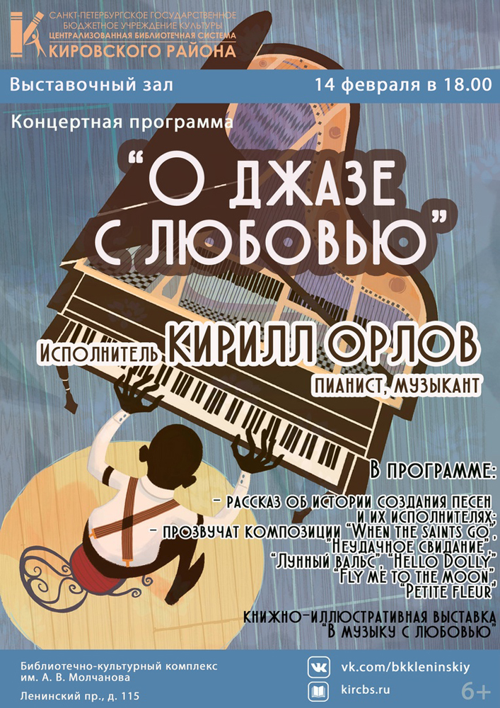 14 февраля в 18.00 в выставочном зале Библиотечно-культурного комплекса им. А. В. Молчанова (Ленинский пр., д. 115) состоится Концерт "О джазе с любовью".