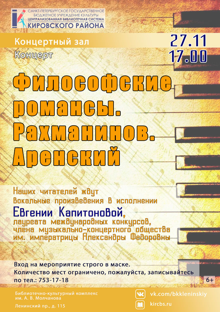 27 ноября в 17.00 в концертном зале Библиотечно-культурного комплекса им. А. В. Молчанова состоится Концерт "Философские романсы. Рахманинов. Аренский".