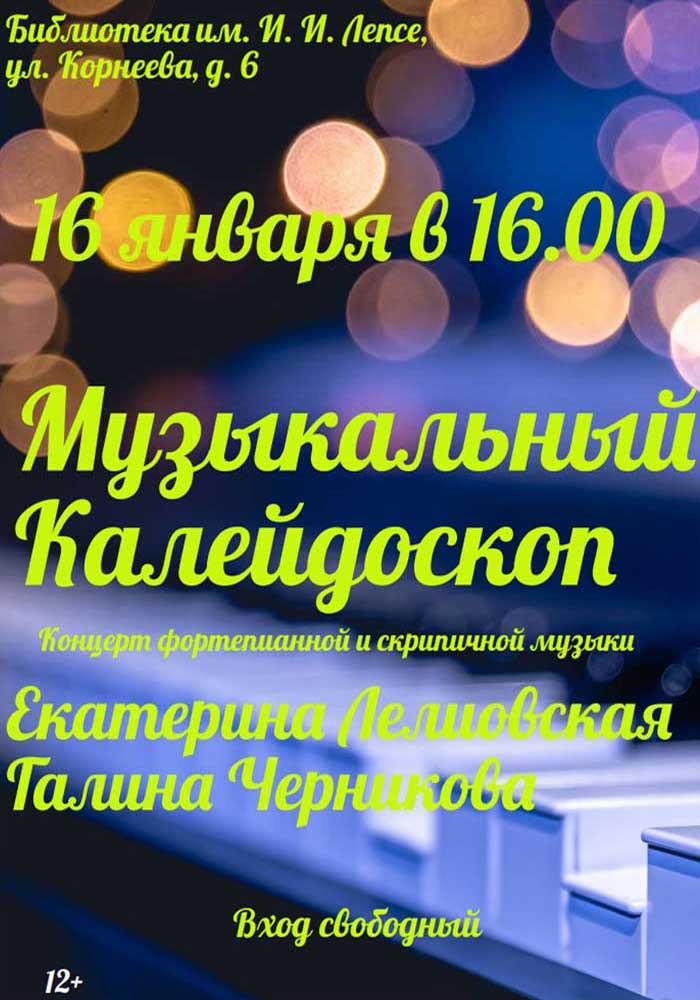 16 января в 16.00 Библиотека №1 им. И. И. Лепсе приглашает всех желающих на Концерт фортепианной и скрипичной музыки "Музыкальный калейдоскоп".