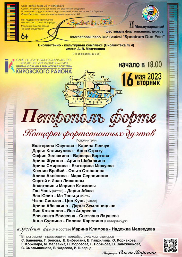 В рамках II Международного фестиваля фортепианных дуэтов (International Piano Duo Festival "Spectrum Duo Fest"), при участии Союза композиторов Санкт-Петербурга, РГПУ им А. И. Герцена, Санкт-Петербургской детской музыкальной школы №7, при поддержке издательства "Композитор - Санкт-Петербург", Межрегионального Союза концертных деятелей в Библиотечно-культурном комплексе им. А. В. Молчанова пройдет концерт фортепианных дуэтов "Петрополь форте".