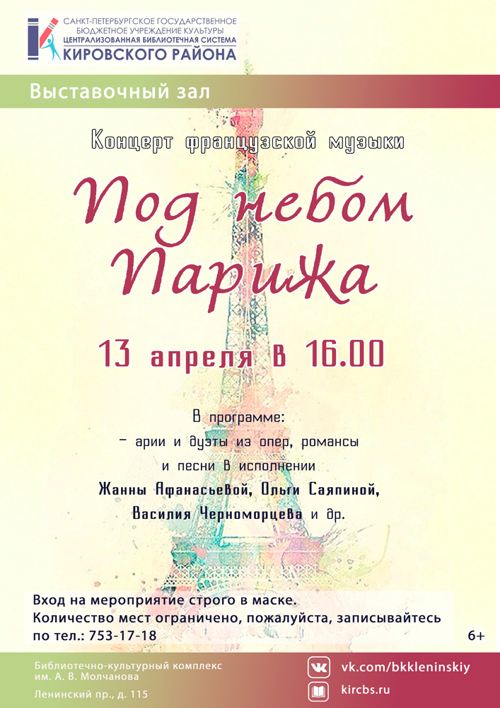13 апреля в 16.00 в выставочном зале Библиотечно-культурного комплекса им. А. В. Молчанова пройдет Концерт французской музыки "Под небом Парижа".