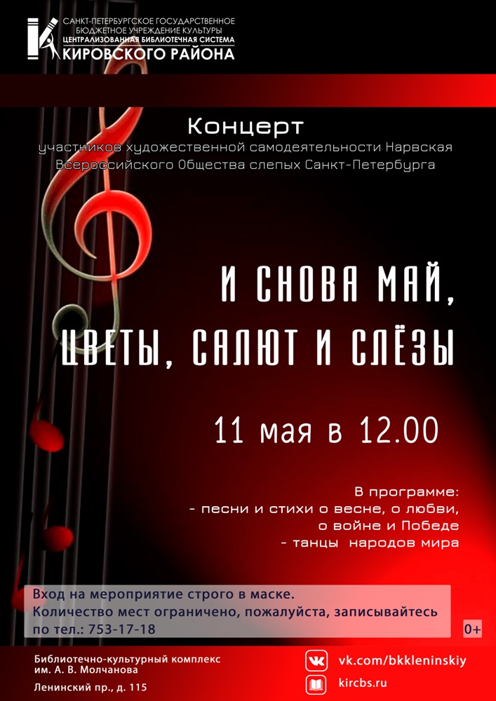11 мая в 12.00 в Библиотечно-культурном комплексе им. А. В. Молчанова состоится Концерт участников художественной самодеятельности Нарвская Всероссийского Общества слепых Санкт-Петербурга "И снова май, цветы, салют и слёзы".
