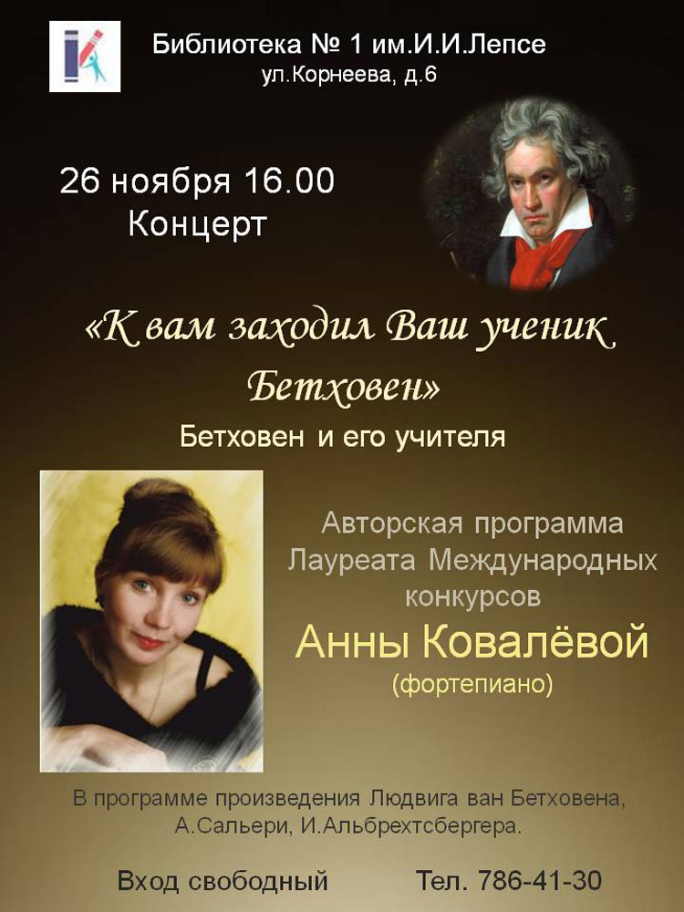 Библиотека №1 им. И. И. Лепсе приглашает на авторскую программу "К вам заходил Ваш ученик Бетховен… Бетховен и его учителя" Лауреата Международных конкурсов Анны Ковалевой (фортепиано).