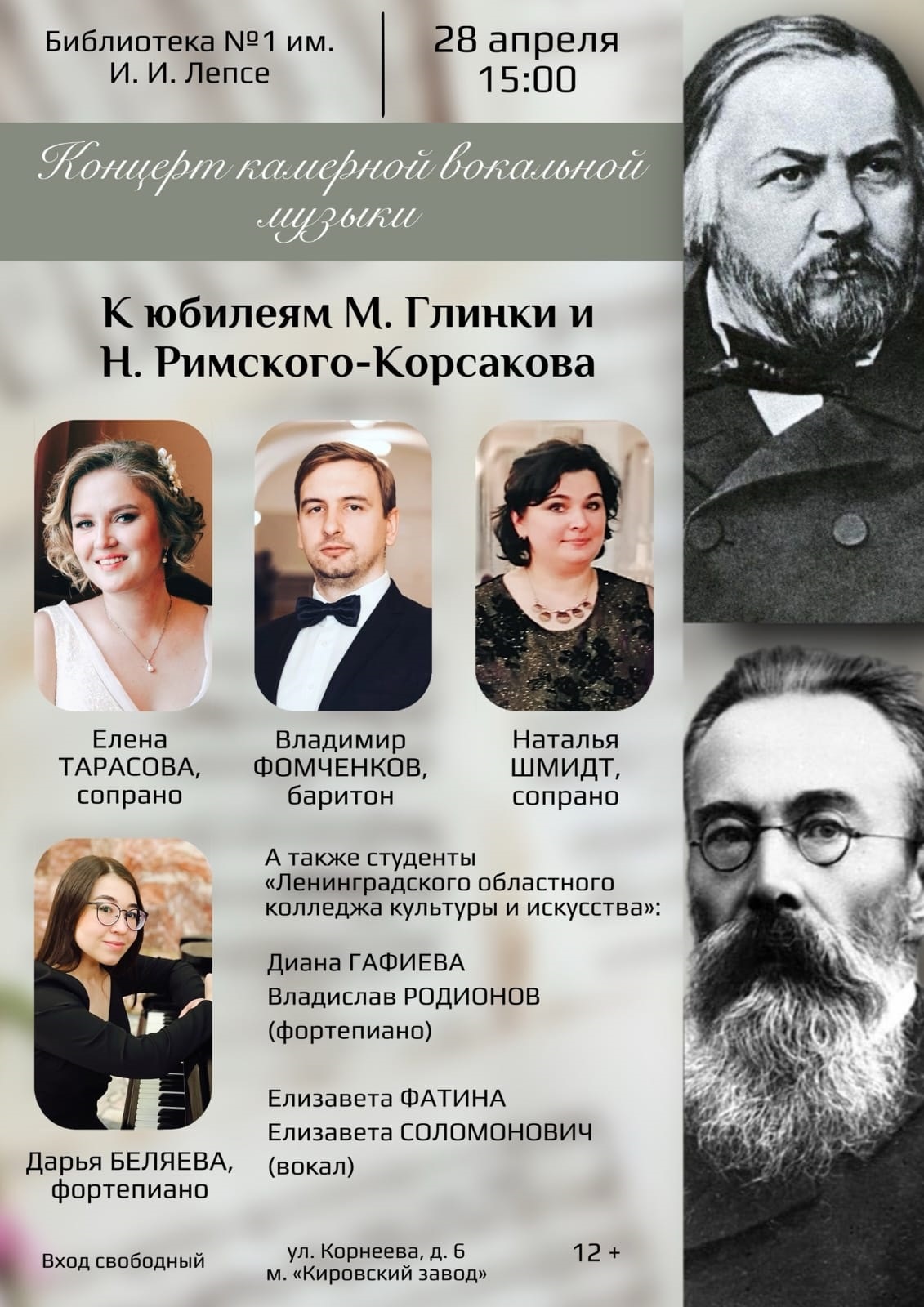 Библиотека №1 им. И. И. Лепсе приглашает на Концерт камерной вокальной музыки "К юбилеям М. И. Глинки и Н. А. Римского-Корсакова".
