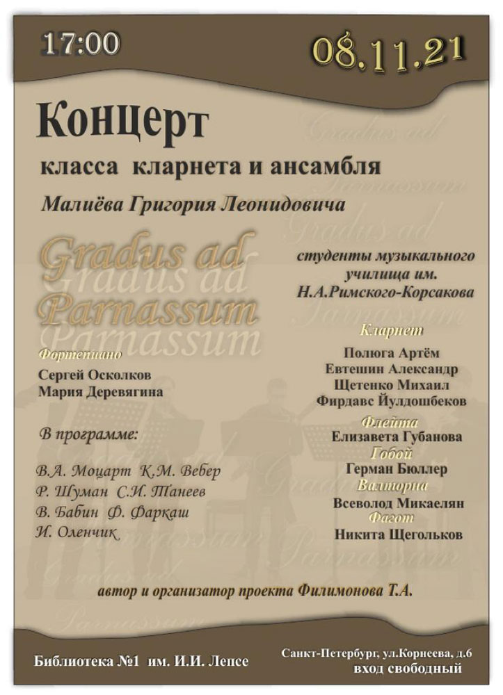 Концерт класса кларнета и ансамбля Малиёва Григория Леонидовича в исполнении студентов Санкт-Петербургского Музыкального училища им. Н. А. Римского-Корсакова.