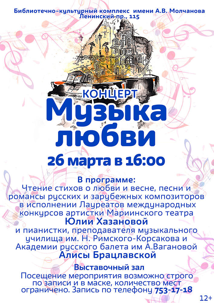 26 марта в 16.00 в Библиотечно-культурном комплексе им. А. В. Молчанова пройдет Концерт "Музыка любви".