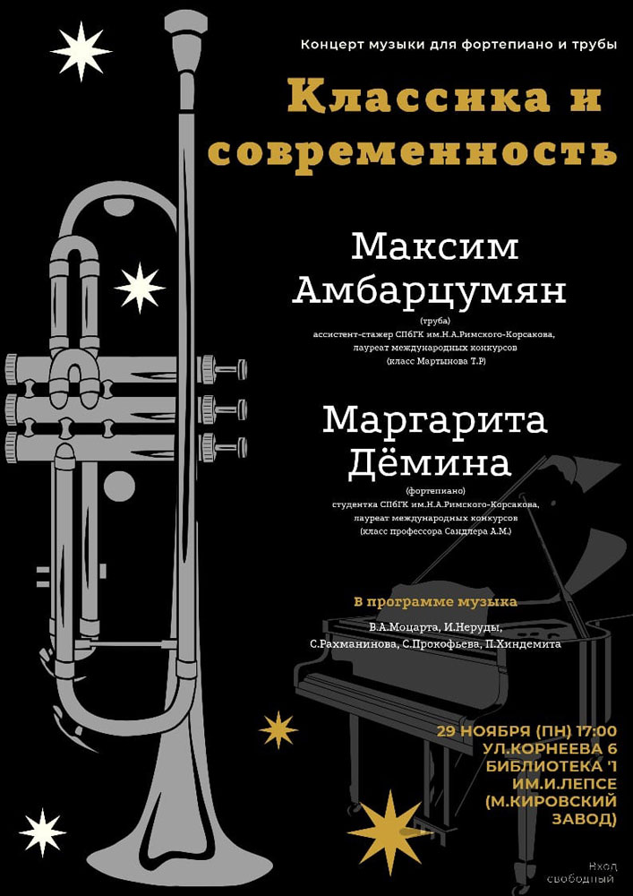 Концерт музыки для фортепиано и трубы "Классика и современность". Исполнители: лауреаты Международных конкурсов Максим Амбарцумян (труба), Маргарита Дёмина (фортепиано).