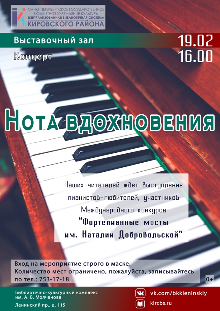 19 февраля в 16.00 в выставочном зале Библиотечно-культурного комплекса им. А. В. Молчанова состоится концерт "Нота вдохновения".