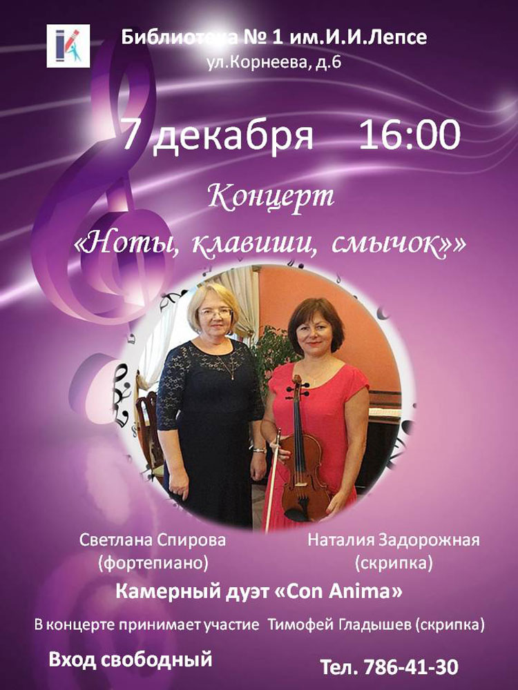 Библиотека №1 им. И. И. Лепсе приглашает на концерт "Ноты, клавиши, смычок" в исполнении концертного ансамбля "Con Anima": Наталья Задорожная (скрипка), Светлана Спирова (фортепиано). В концерте также принимает участие Тимофей Гладышев (скрипка).