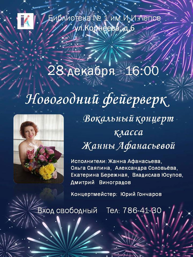 Библиотека №1 им. И. И. Лепсе приглашает на вокальный концерт класса Жанны Афанасьевой "Новогодний фейерверк".