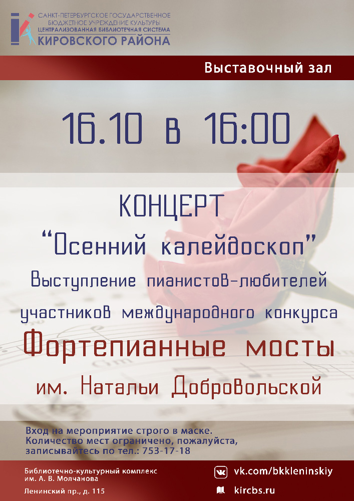16 октября в 16 часов в выставочном зале Библиотеки №4 (Библиотечно-культурный комплекс) им. А. В. Молчанова состоится Концерт "Осенний калейдоскоп".